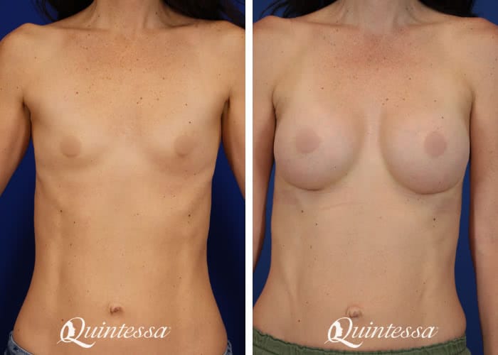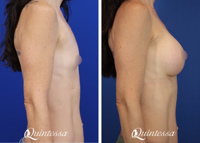 Patient received a bilateral dual plane breast augmentation with 320 cc (left) and 340 cc (right) demi profile Motiva Ergonomix silicone implants. Age: 42 Height: 5’6″ Weight: 125 lbs