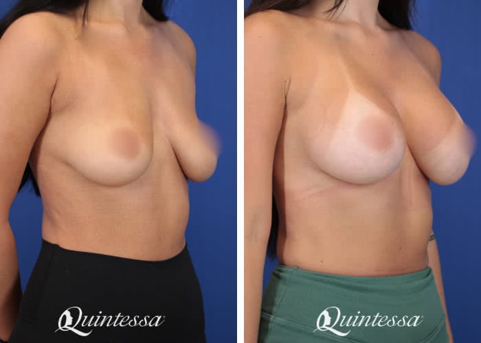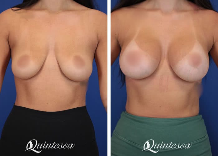 Patient received a bilateral dual plane breast augmentation with 365 cc (left) and 415 cc (left) full profile Natrelle Soft Touch silicone implants with TIGR mesh support. Age: 22 Height: 5’4″ Weight: 130 lbs