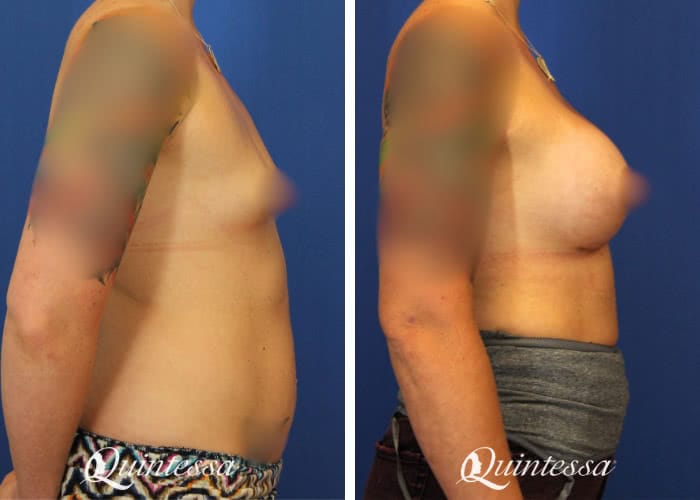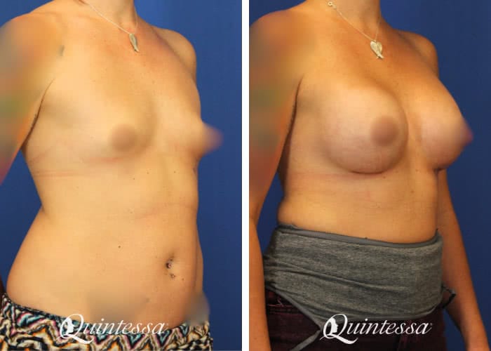 This patient received a bilateral dual plane breast augmentation with 450 cc (left) and 485 cc (right) full profile Natrelle Soft Touch silicone implants. Age: 30 Height: 5’6″ Weight: 156 lbs