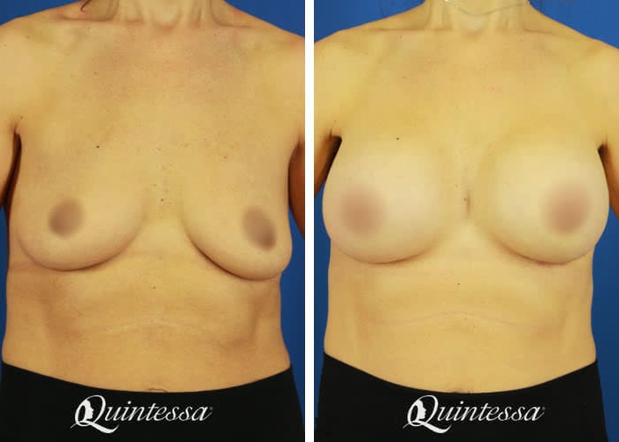 Patient received a bilateral dual plane breast augmentation with 385 cc (left) and 415 cc (right) full profile Natrelle Soft Touch silicone implants with Galaflex mesh support. Age: 45 Height: 5’1″ Weight: 125 lbs