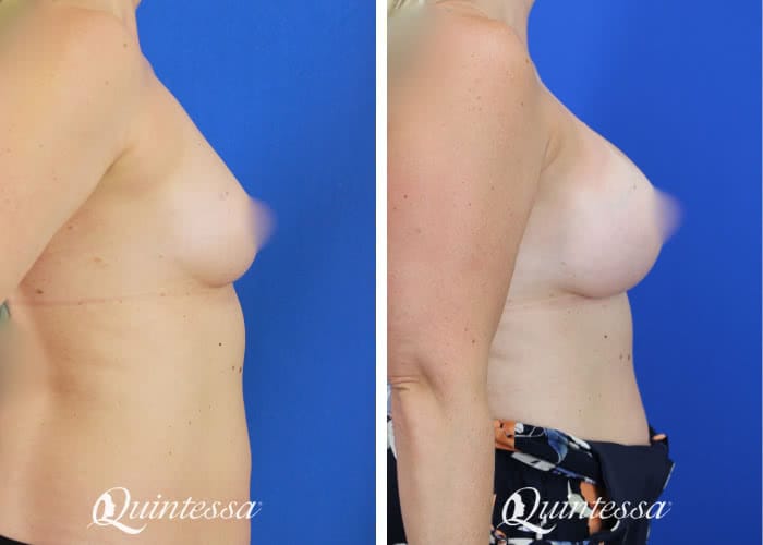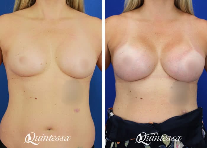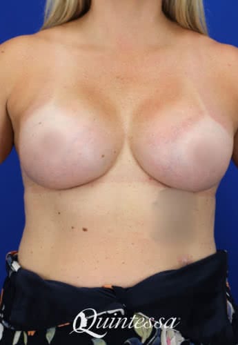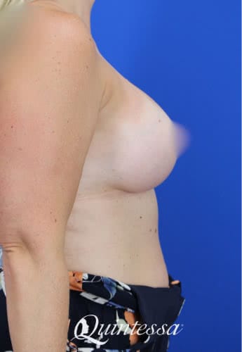 This patient wanted a full but natural look. She received a bilateral dual plane breast augmentation with 350 cc (left) and 415 cc (right) high profile Sientra highly cohesive plus implants. Age: 43 Height: 5’6″ Weight: 155 lbs