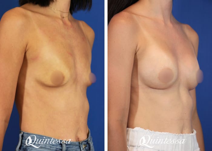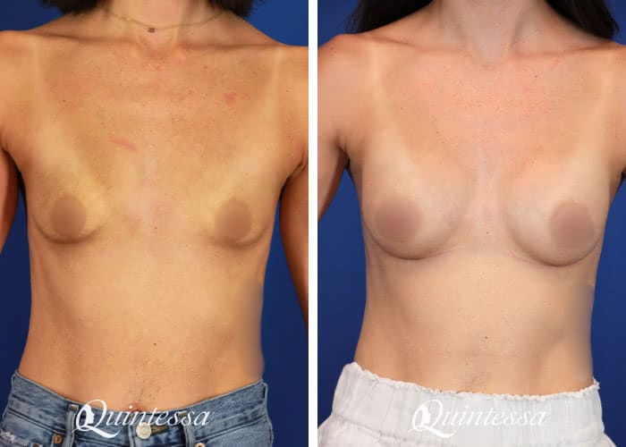 Patient received a bilateral dual plane breast augmentation with 220 cc low plus profile Natrelle Soft Touch silicone implants. Age: 33 Height: 5’6″ Weight: 115 lbs