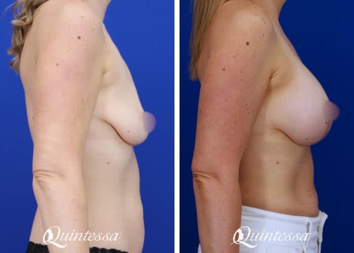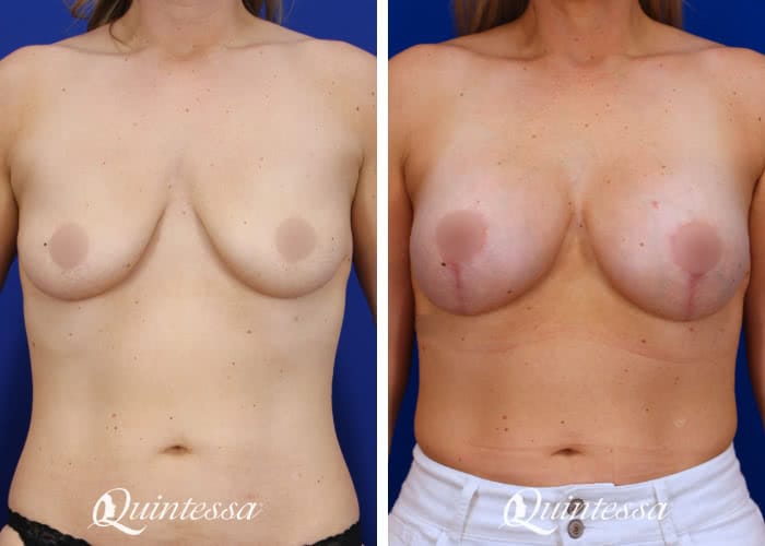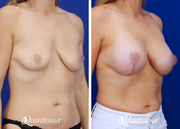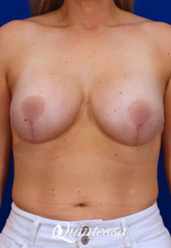 Patient received a bilateral subfascial breast augmentation with 405 cc moderate profile Natrelle Soft Touch silicone implants and a bilateral mastopexy with TIGR mesh support. Age: 38 Height: 5’8″ Weight: 163 lbs