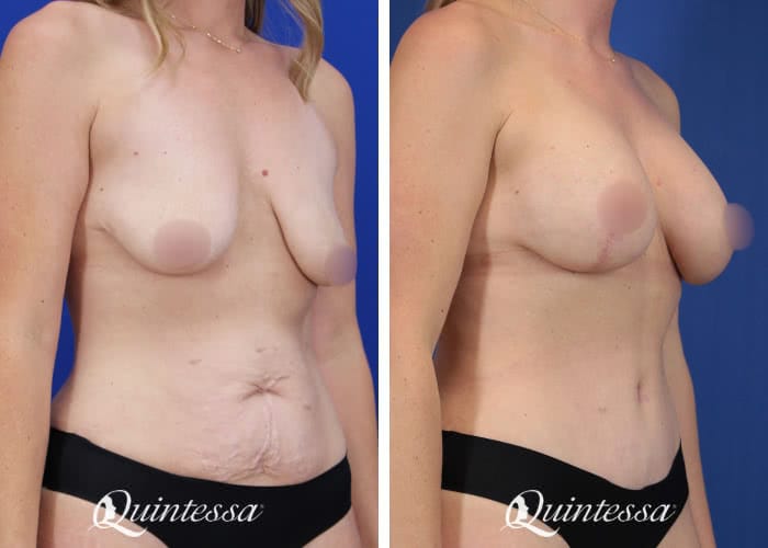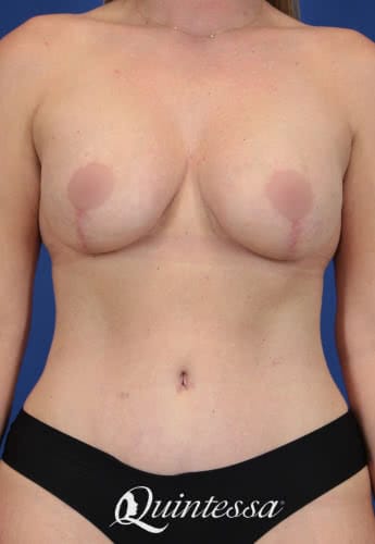 After losing 85 pounds, this patient desired a more contoured look. She received an abdominoplasty with circumferential torso liposuction, liposuction of outer thighs, a bilateral dual plane breast augmentation with 375 cc moderate profile Natrelle Soft Touch silicone implants and a bilateral mastopexy with TIGR mesh support. Age: 40 Height: 5’6″ Weight 180 lbs