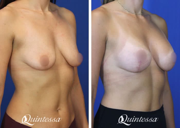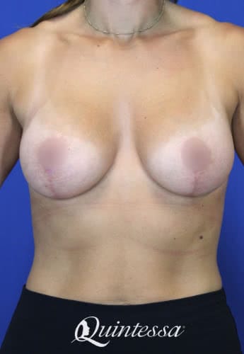 This patient desired more upper pole fullness and participated in an active lifestyle. She received a bilateral dual plane breast augmentation with 275 cc moderate profile Natrelle Soft Touch silicone implants and a bilateral mastopexy. Age: 38 Height: 5’8″ Weight: 150 lbs