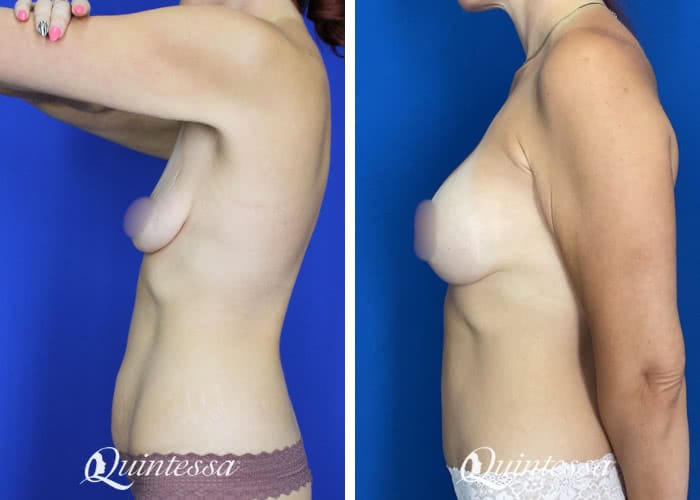 35 years old patinet who underwent submuscular breast augmentation with lift using a moderate profile round 375cc silicone implant. She is 5’5″ and weighs 159Ibs.