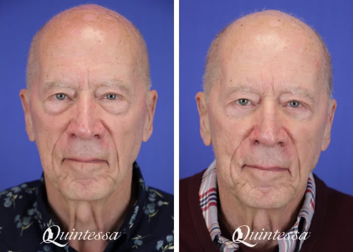 This patient underwent upper and lower eyelid rejuvenation to open and brighten the eyes while maintaining a natural, refreshed appearance. Results show 6 months after treatment. Age: 78