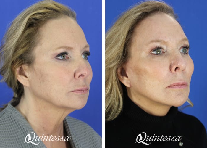 62 year old patient who underwent deep plane face and neck lift with left earlobe repair and a gliding browlift. She is 5’7″ and 172lbs