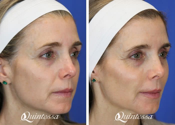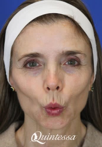 This 58-year-old patient received a customized filler treatment for full-face rejuvenation, restoring volume in the cheeks, softening smile and marionette lines, and smoothing fine lines around the lips. Results are shown 3 weeks after treatment.